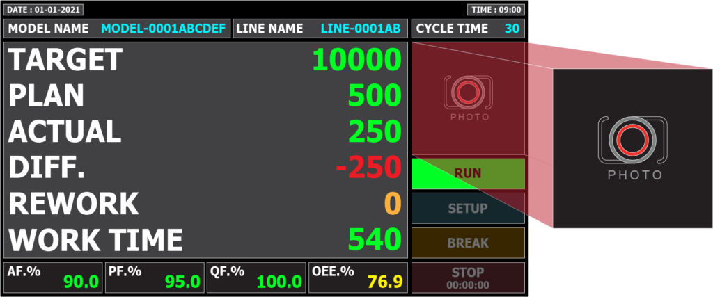 แสดงของเสียในระหว่างที่ผลิตสามารถรับ Input (On/Off Contact) ได้จาก Push Button , Photo Sensor, Barcode Scanner (Custom)
